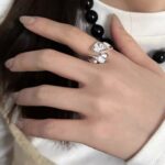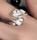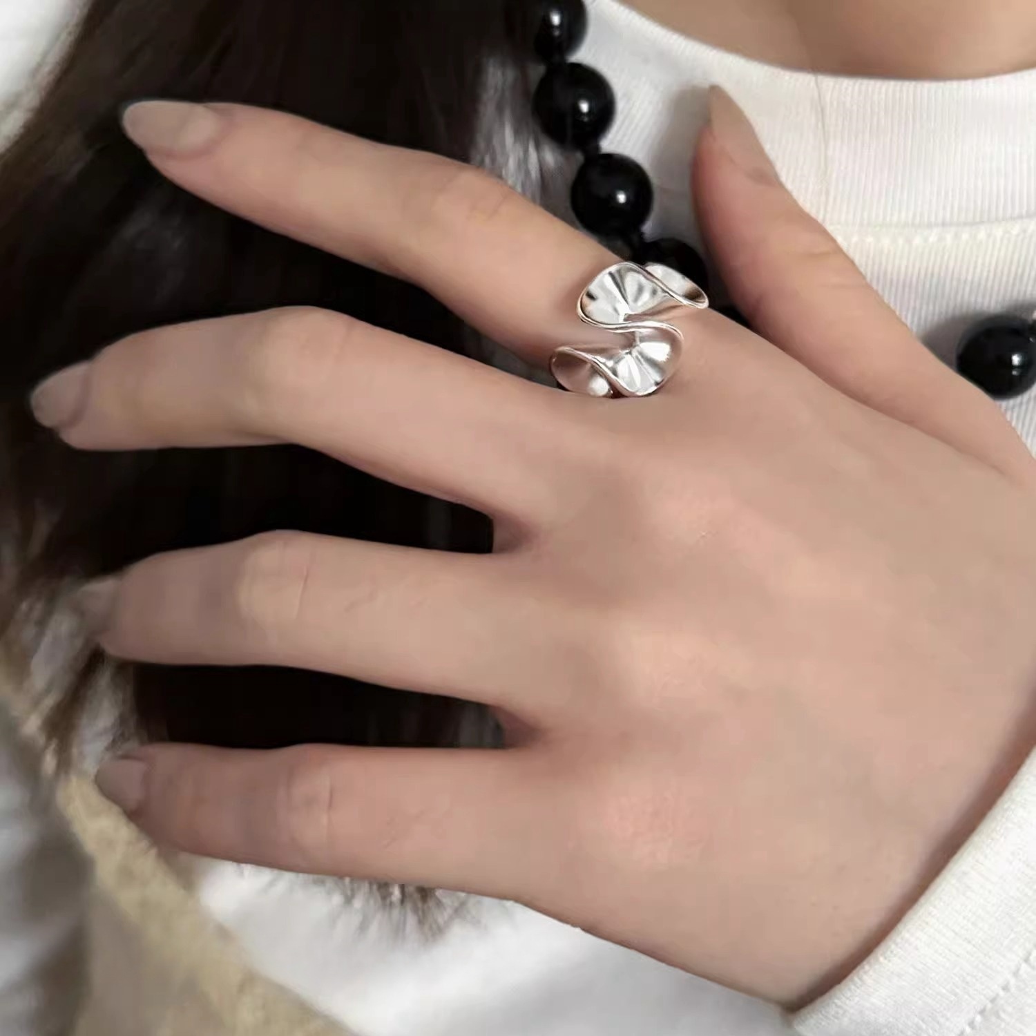 This is a unique ring designed in silver metal material, with a modern and artistic shape. The surface of the ring has two irregular curved shapes, resembling abstract forms of petals or leaves, adding fluidity and a sense of three dimensionality. The overall design is simple yet fashionable, suitable for people who pursue personalization and unique style to wear.