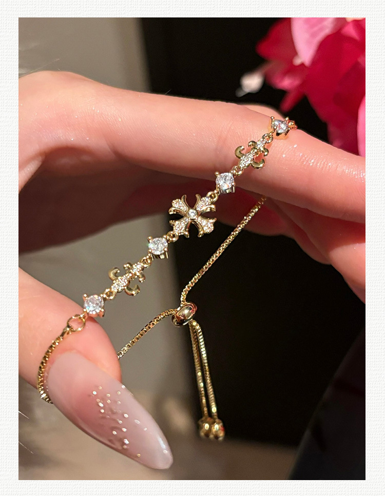 This bracelet is designed with a cross as the main element, and the metal shape is embedded with shiny zircon, presenting an elegant and fashionable atmosphere.